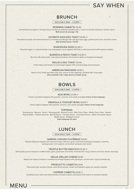Location: 109-111 High Street, Gosforth. 15 - 20 mins by metro/bus to centre of Newcastle. Metro - Regent Centre Click here for map Open: every day 8am - 11pm. Email: info@saywhenbar.com Instagram: instagram.com/saywhengosforth Website: saywhenbar.com Beers: 3 draught beers on tap including Guinness. A good selection of wines on offer from self-serve wine machines, with a simple tap of your card, you can pour a 50 ml taster, a 175 ml glass, or a 250 ml serve from their curated selection of 30 wines. Meals: Menu 1 Menu 2 Food on offer includes: Brunch available from 8am - 3.30pm with Morning Ciabatta £5.95 Ultimate Avocado Toast £10.95 Shakshuka Eggs £12.95 Burrata & Pesto Toast £10.95 Nduja & Egg Toast £10.95 American Pancakes £9.95 Bowls available from 8am - 3.30pm with Acai Bowl £11.95 Granola & Yoghurt Bowl £8.95 Extra Toppings £2.00 each Lunch available from 11am - 3.30pm with Harissa Chicken Flatbread £14.95 Truffle Butter Gnocchi £12.95 Nduja Grilled Cheese £9.95 Prosciutto Ciabatta £9.95 Caprese Ciabatta £9.95 Small Plates available from 4pm - 9.30pm daily £7.95 each or 3 for £21.95 Extras £2.95 - £5.95 Sharing Boards - Cheese board £16.95 each or Charcuerie Board for £26.95 Hot drinks available. Special Deals: TBC Live Sports: None shown in bar. Music: Regular music on play at all times.